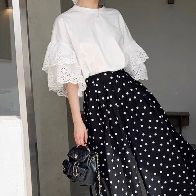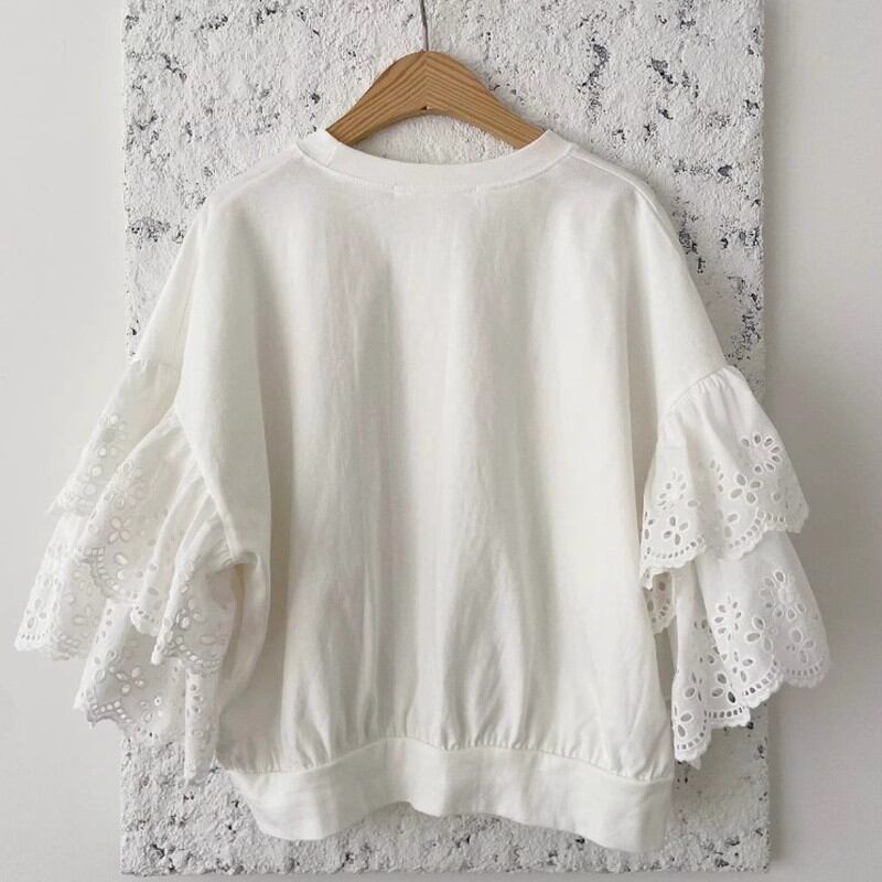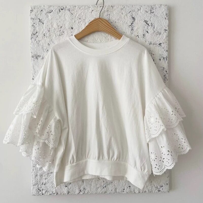 ▶︎レースが施されたティアードスリーブがポイントのカットソー。