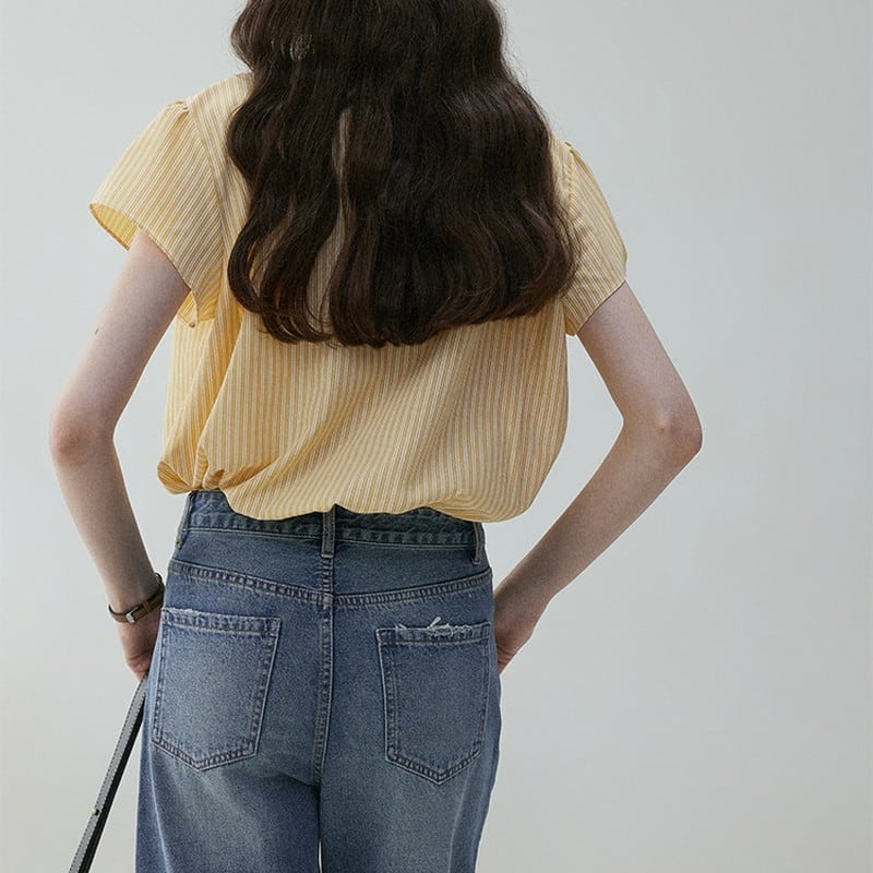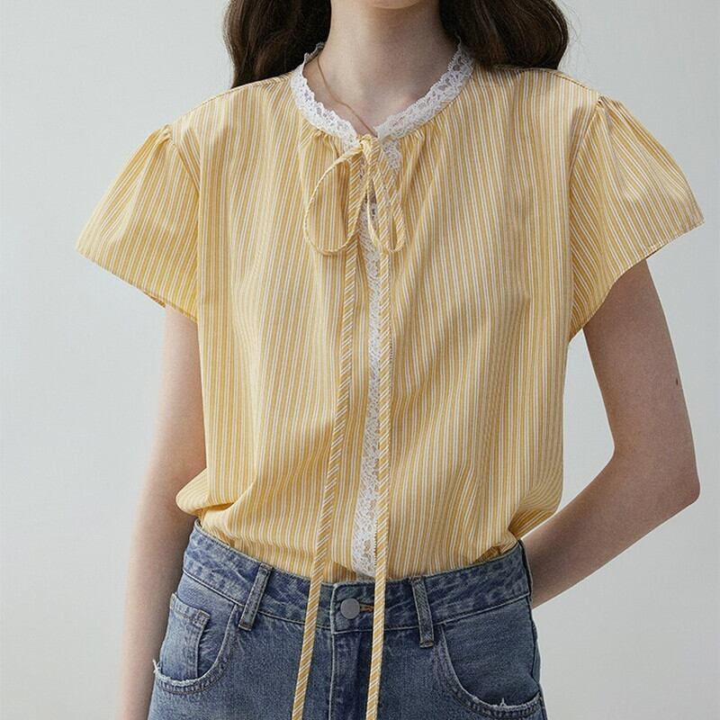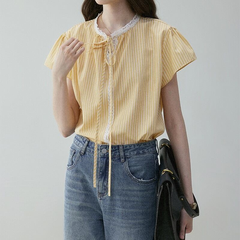▶︎ストライプ柄と繊細なレースの組み合わせが魅力的なブラウスです。