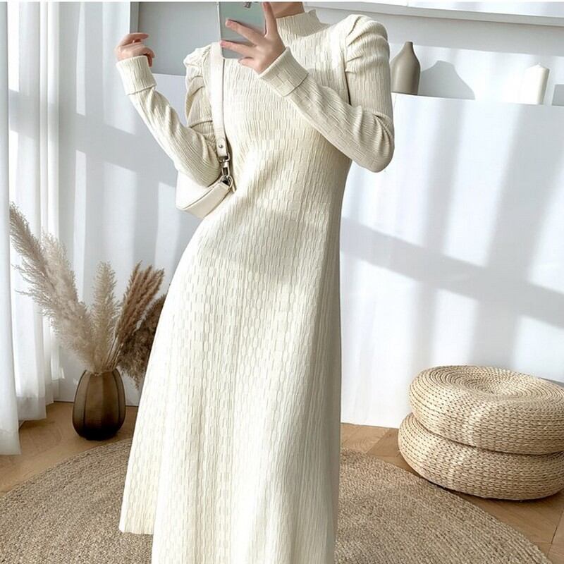 ▶︎表面感のある素材が可愛い大人のロングワンピース。足元はブーツがおすすめです。
