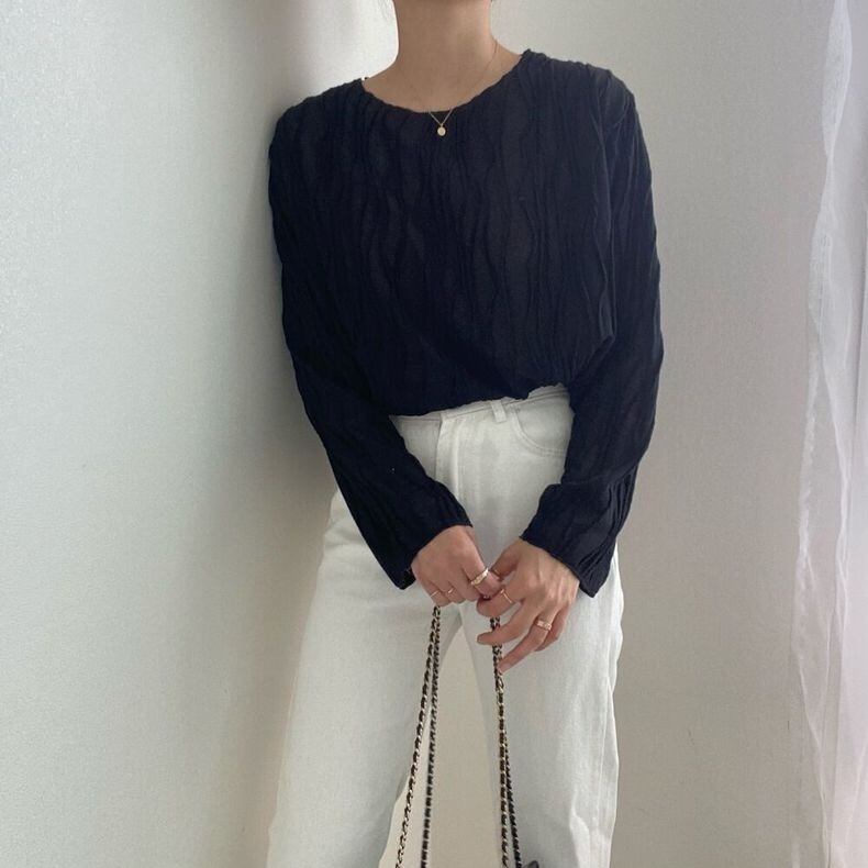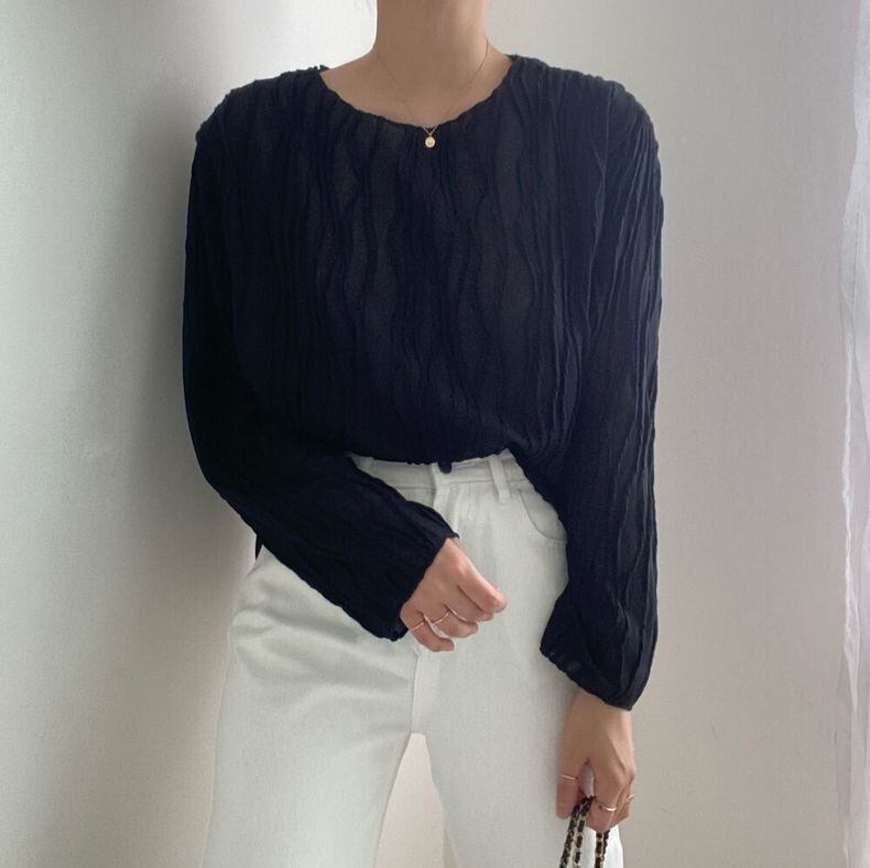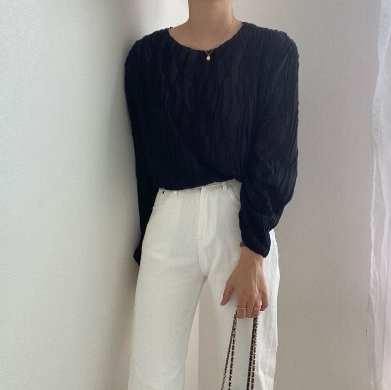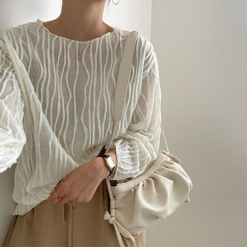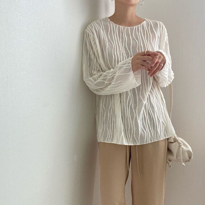 ▶︎ 甘辛MIXのオシャレが叶うシアーブラウス。軽やかで透け感のある素材が、女性らしい印象を与えます。丈感も絶妙で、パンツやスカートどちらにもマッチします。