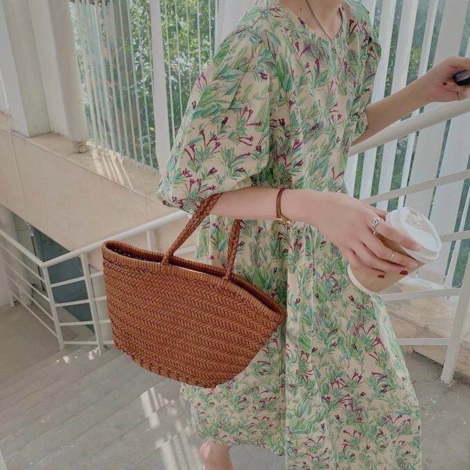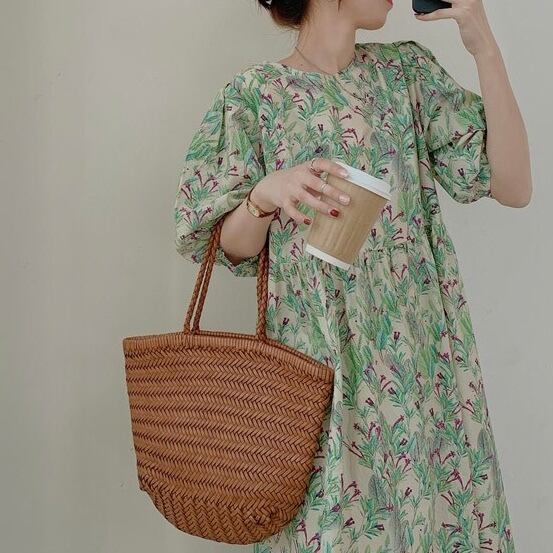 ▶︎ フレンチな雰囲気が漂う、ボタニカル柄のワンピースです。パフスリーブとラウンドネックが女性らしさを引き立て、丈感が可愛くて上品。街中はもちろん、リゾート地でも大活躍してくれます。