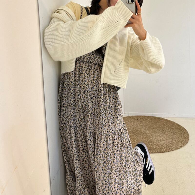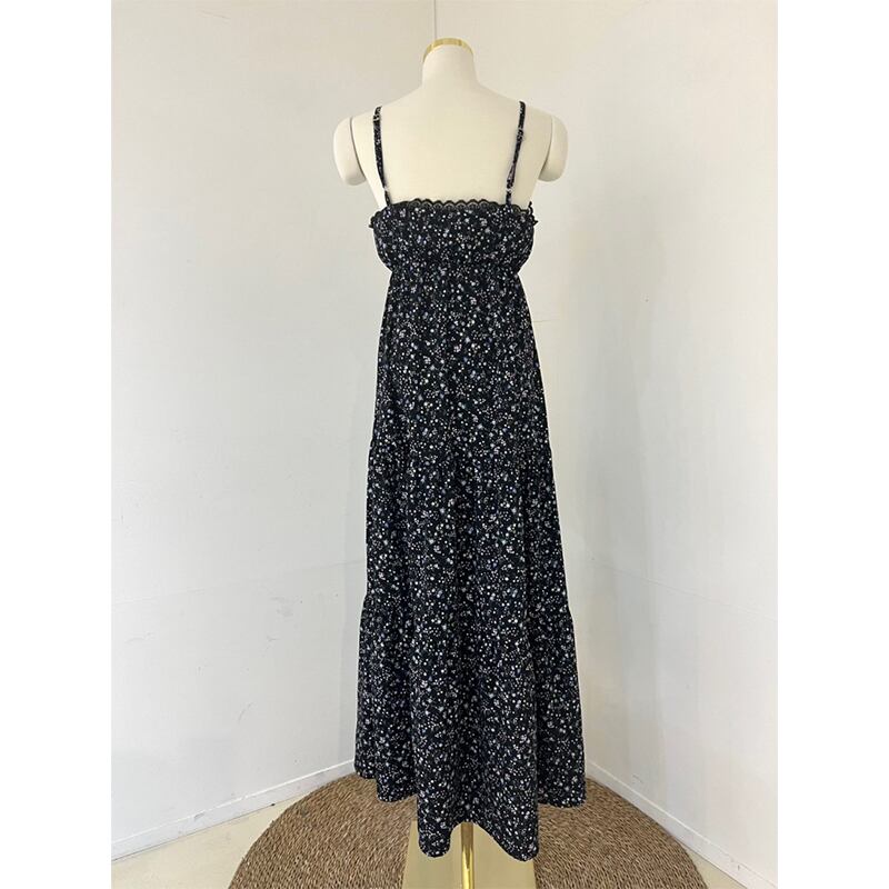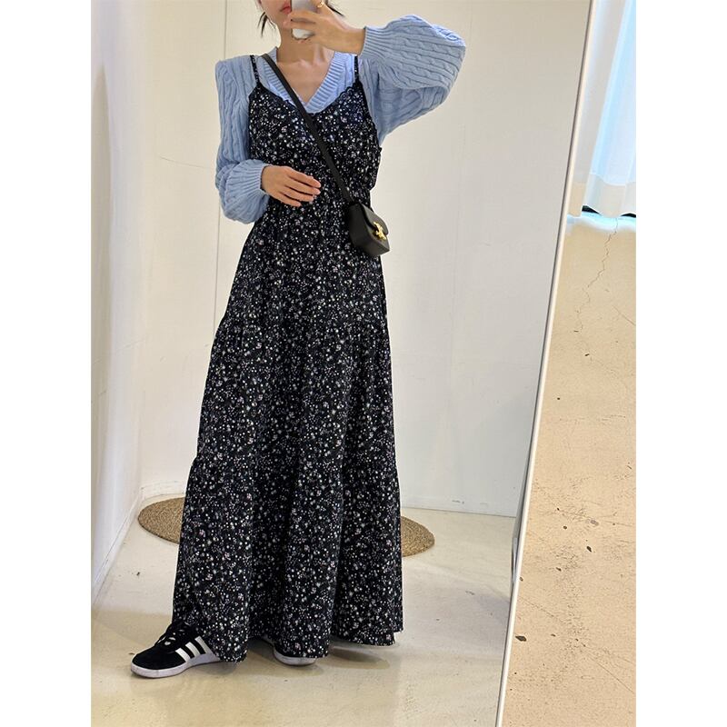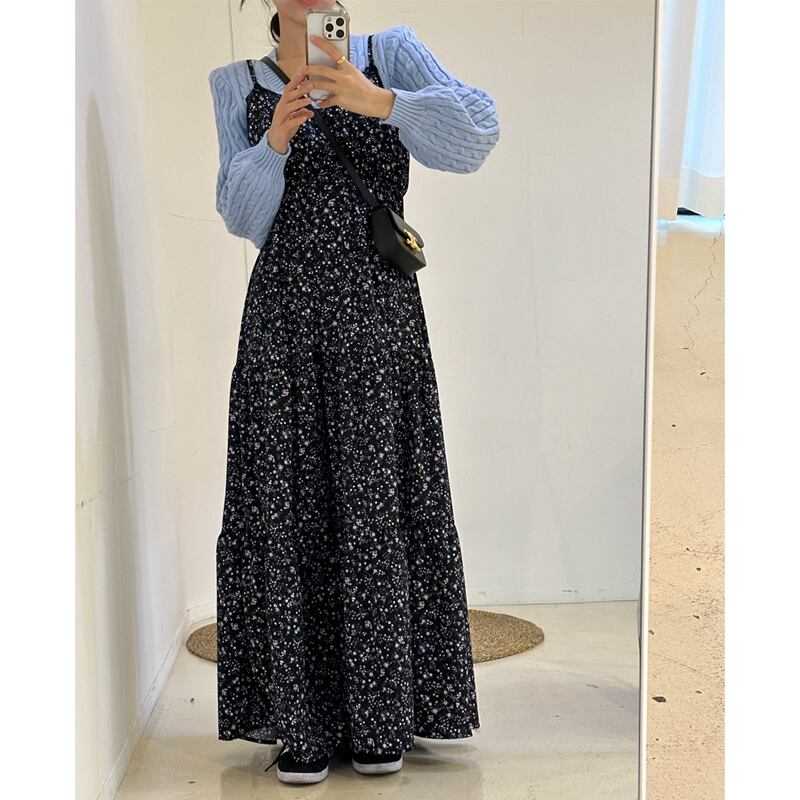 ▶︎ さりげないレース使いや小花柄が女性らしい印象を演出してくれるフェミニンなロングキャミワンピース。