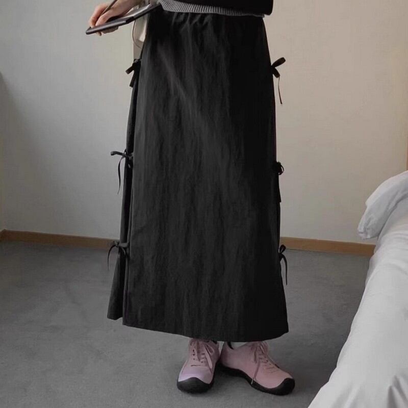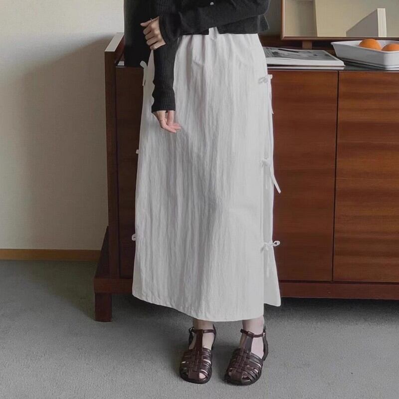 ▶︎サイドに入ったリボンがアクセントになったロングスカート。バックにはスリットも入って足捌きもしやすいデザインです。
