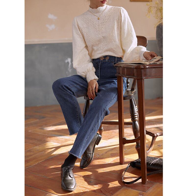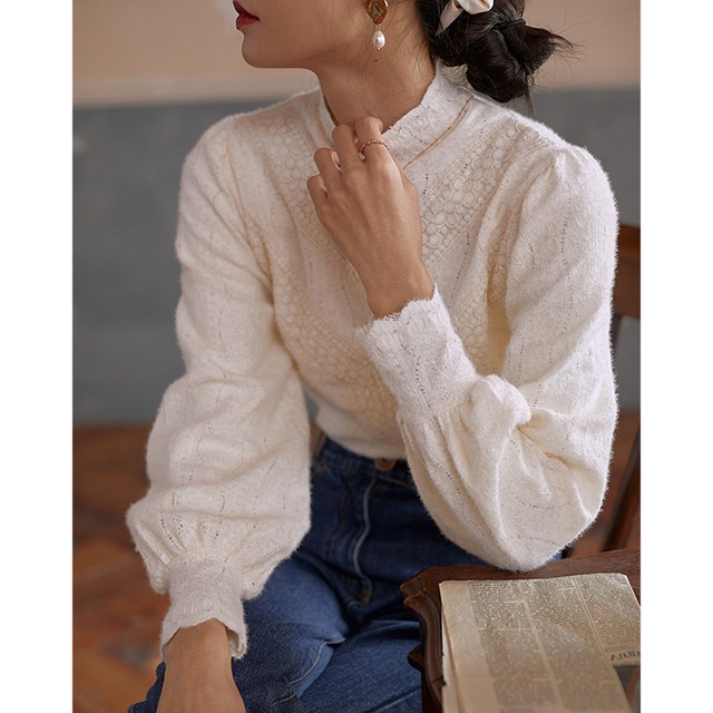 スタンドカラーにすることで全体が引き締まり、甘くなりすぎないレーストップスに。